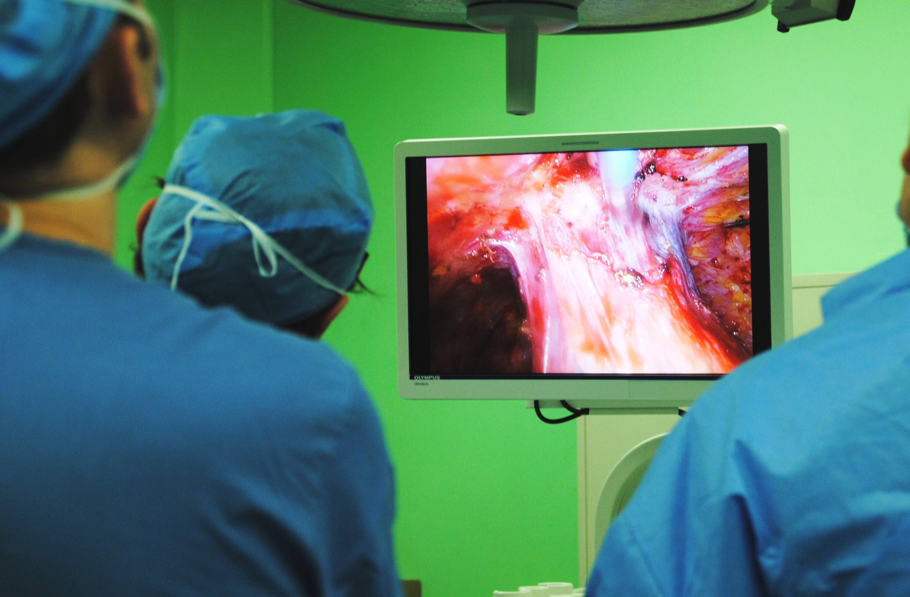 The operating surgeon stood on the right side of the patient, the assistant stood on the patient’s left side and operated the endoscope. The monitor was positioned at the right side of the patient toward the cranial side of the bed.