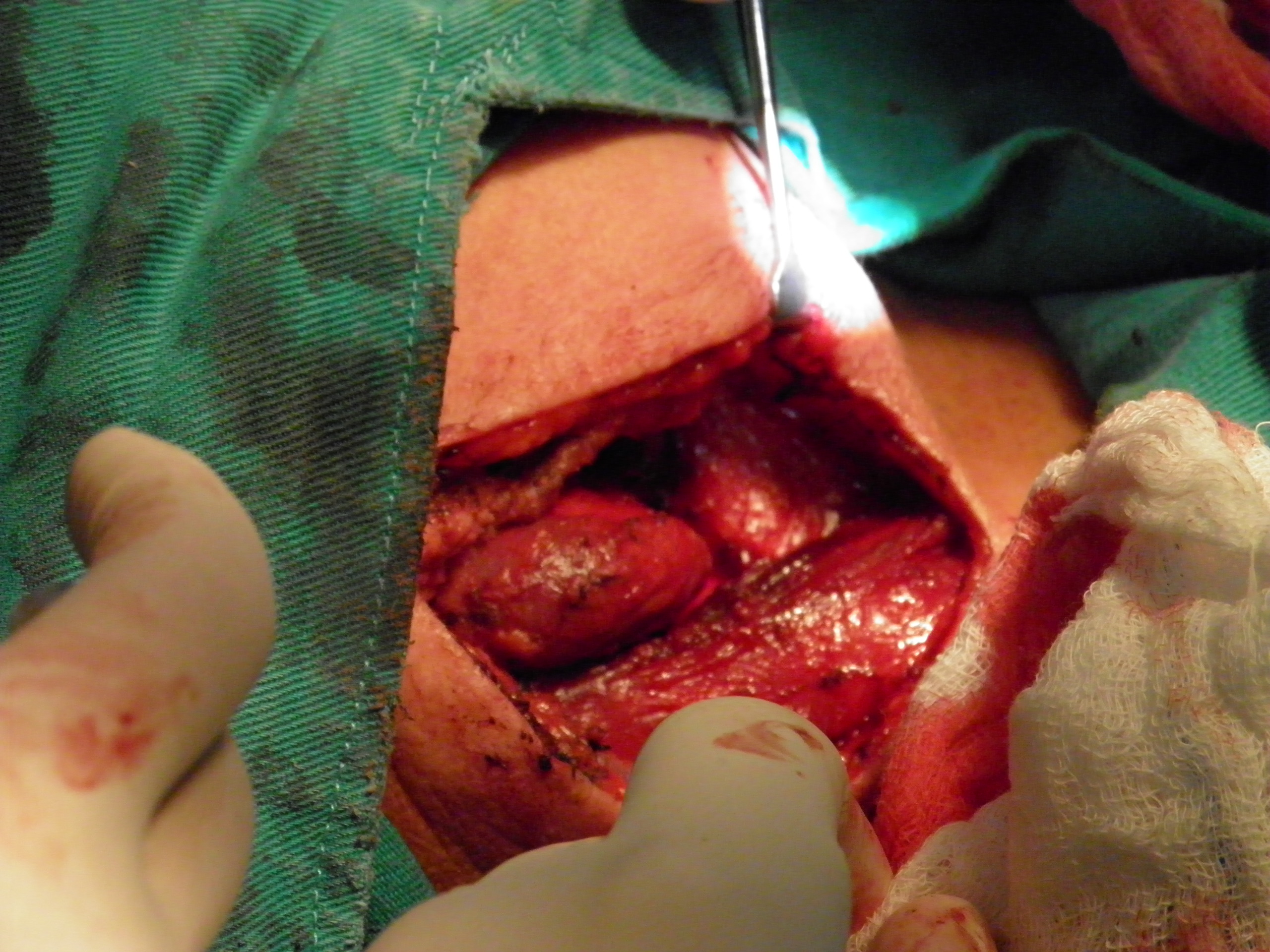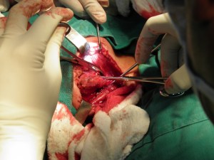 After administration of general anesthesia, and endotracheal intubation, the patient was positioned, prepped and draped in sterile fashion. A 4cm vertical skin incision was made on the right side of the neck. After blunt dissection and retraction of sternoclastomastoid muscle, the common carotid artery was identified and retracted with a vessel loop. Identifying the bifurcation and loosely clamped external and internal carotids. Care was taken to identify and prevent injury to the hypoglossal nerve and fascial branches.
